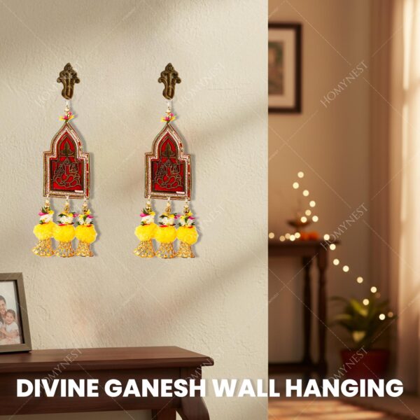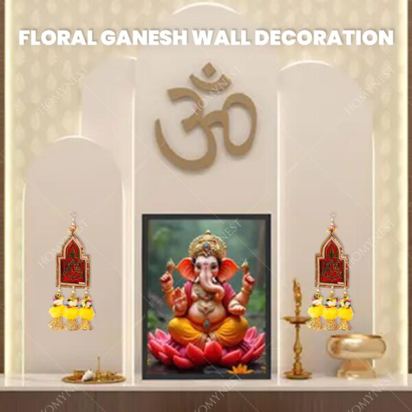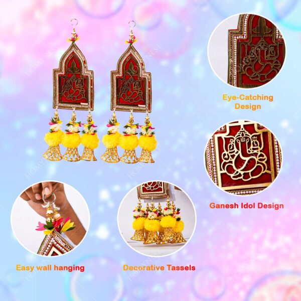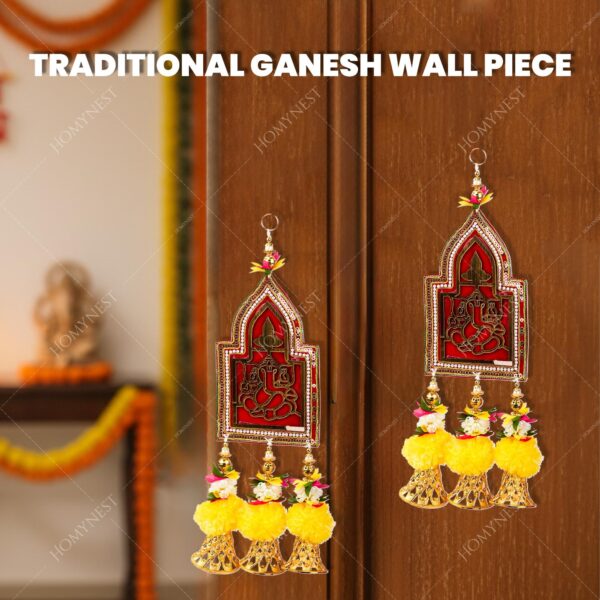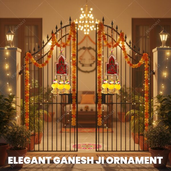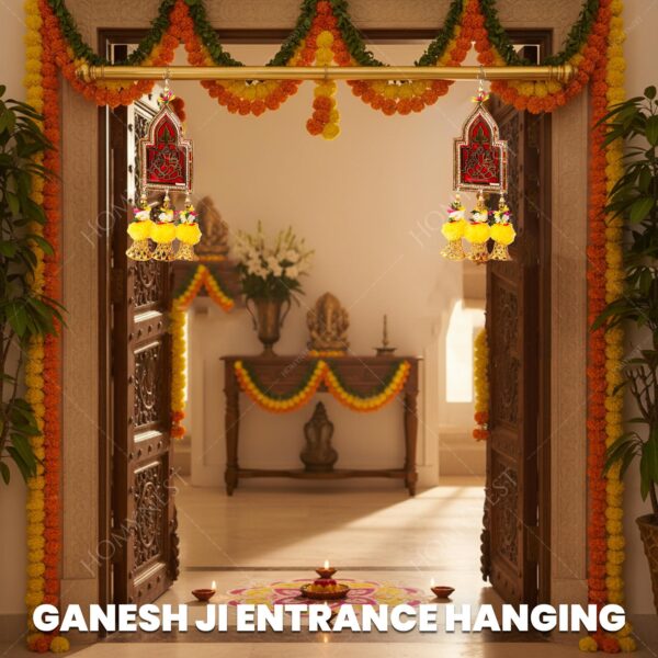 1. Inside the Box – Ganesh Wall Hanging Set (Pack of 2): Each box delivers two premium handmade wall hangings with a soft dark red cloth base, golden Ganesh Ji motif, bohemian pearl border, six golden bells, artificial marigold flowers, thread, and white pearl and golden bead details. Vibrant colors (red, orange, green, white, gold) instantly brighten your home décor for Diwali, pooja, and positive energy. ganesh wall hanging, festival home decor, diwali hanging, doors.