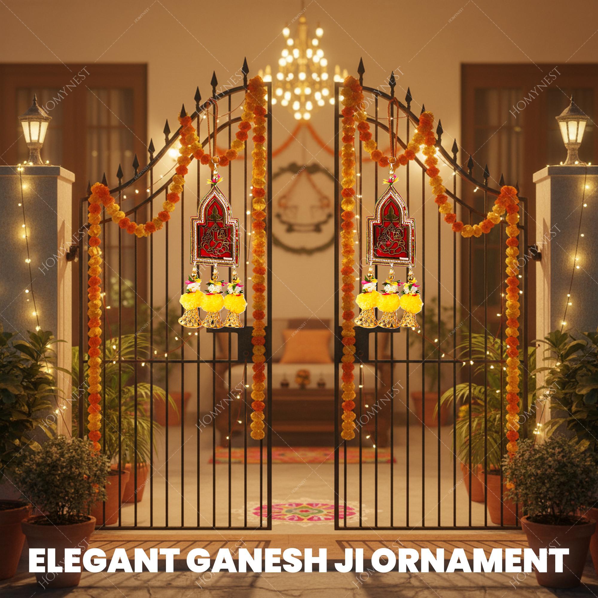 Homynest Ganesh Wall Hanging Set of 2 – Handmade Multicolor Cloth Festival Decor with Pearl Beads, Golden Bells & Artificial Flowers, Boho Rectangular Good Fortune Art for Diwali, Home, Entrance