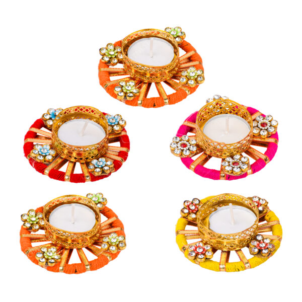 2. Handcrafted Multicolor Design: Rich orange thread wraps, golden accents, and flower jewels add a bright, festive touch to every celebration. handmade diya, multicolor tealight, festival decor