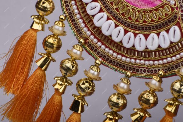 2. Premium Handcrafted Detailing: Boasts intricate embroidery, bold thread lass work, cowrie shell line, pearl beads, and golden brass-like tassels for luxury spiritual aesthetics with bohemian style. handmade wall art, bohemian decor, beaded wall hanging handmad, bohimenan, beed art