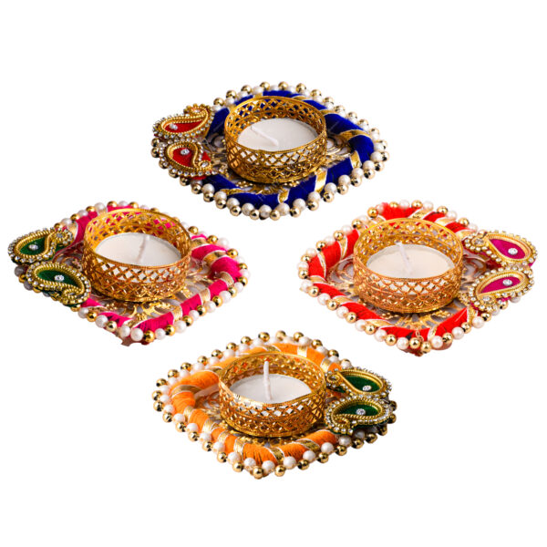 2. Handmade Multicolor Design: Each diya is uniquely hand-crafted, featuring vibrant threads (golden, pink, red, green, purple, yellow) and intricate golden gota, ensuring traditional elegance and festive appeal for any occasion. handmade diya, multicolor tealight, festival decor
