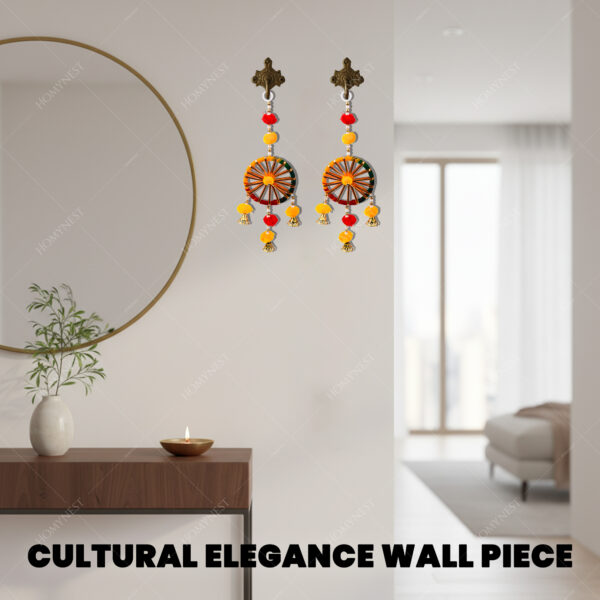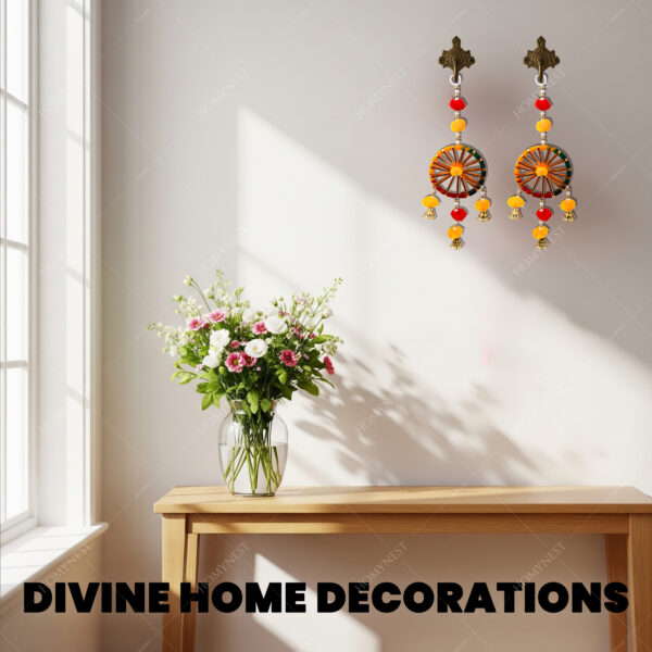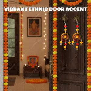 1. Inside the Box – Wheel Door Hanging Set: Includes 1 handmade wheel-shaped wall/door hanging (30×10.5×2.5cm, 38g), crafted from multicolor plastic and fabric, with decorative pom poms (yellow, orange, red), golden bells, pearl and bead details. Unique festival accessory delivering beauty and good fortune to any entryway or pooja space. wheel door hanging, wall latkan, festival decor, diwali wall, home entrance dor hanging, latkhan, dewali